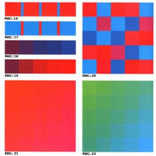 На рисунках 23-28 представлены три пары дополнительных цветов и их смеси, позволяющие получить серый тон. Цветовая градация полос, образованных при смешении каждой пары дополнительных цветов, определяется постепенным увеличением количества цвета, добавляемого к основному. При этом в центре каждого из этих рядов возникает тот нейтральный серый, который свидетельствует, что данная пара цветов является дополнительной. Если же этого серого не получается, то выбранные цвета не являются дополнительными. Рисунок 29 демонстрирует композицию из красного и зелёного и различных модуляций, возникающих при их смешении. Рисунок 30 составлен из квадратов, образованных смешением двух пар дополнительных цветов: оранжевого и синего и красно-оранжевого и сине-зелёного.